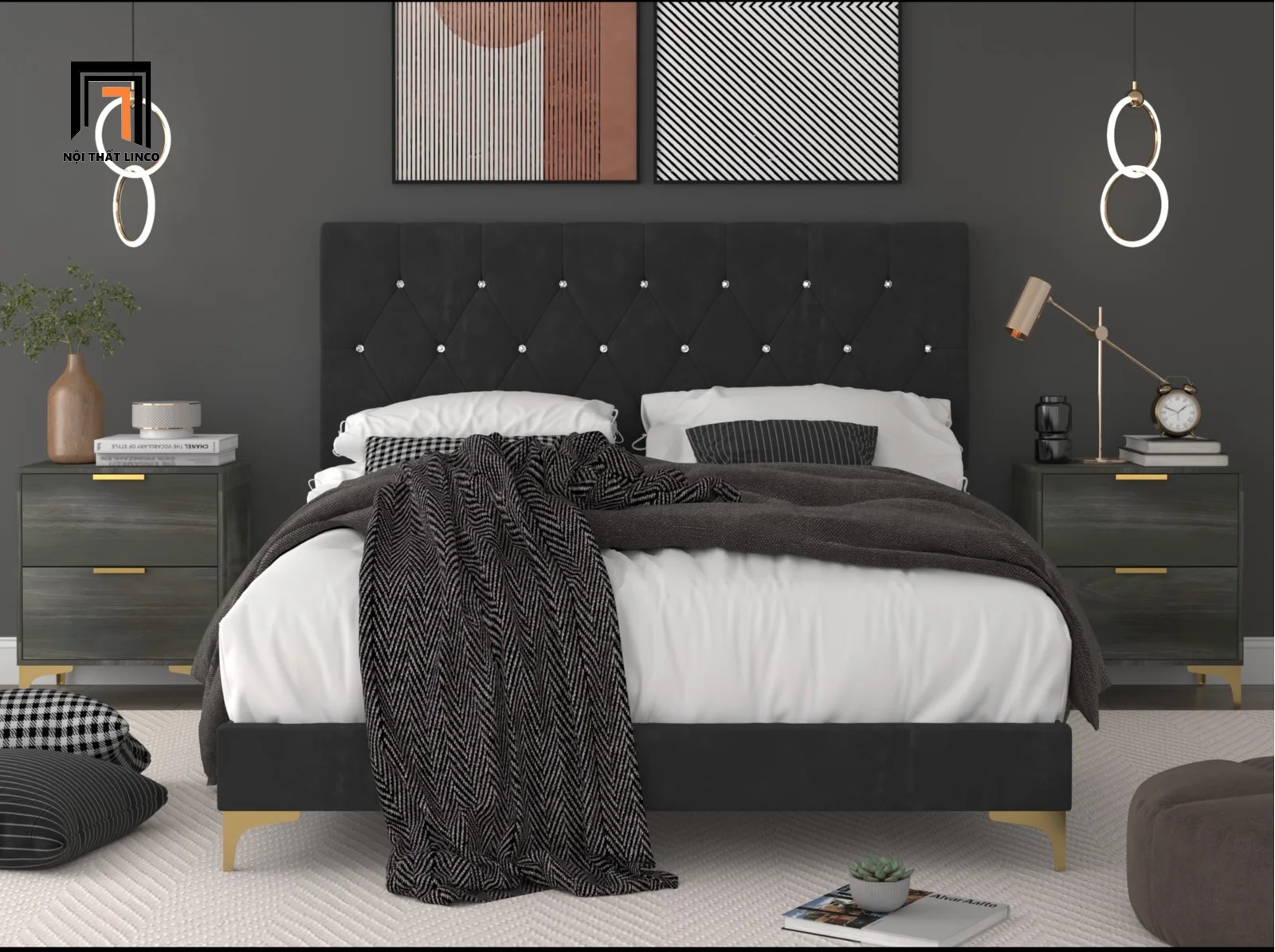 Giường ngủ màu đen vải nhung GN20 Ossabaw đính nút sang trọng