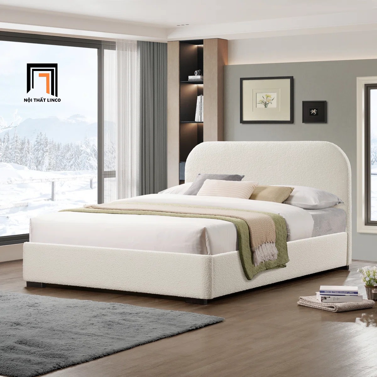 Giường ngủ màu trắng kem GN122 Reigen bọc vải lông cừu mềm